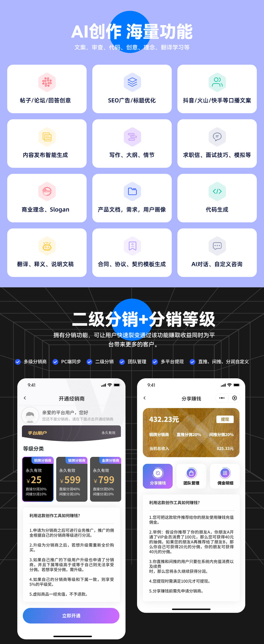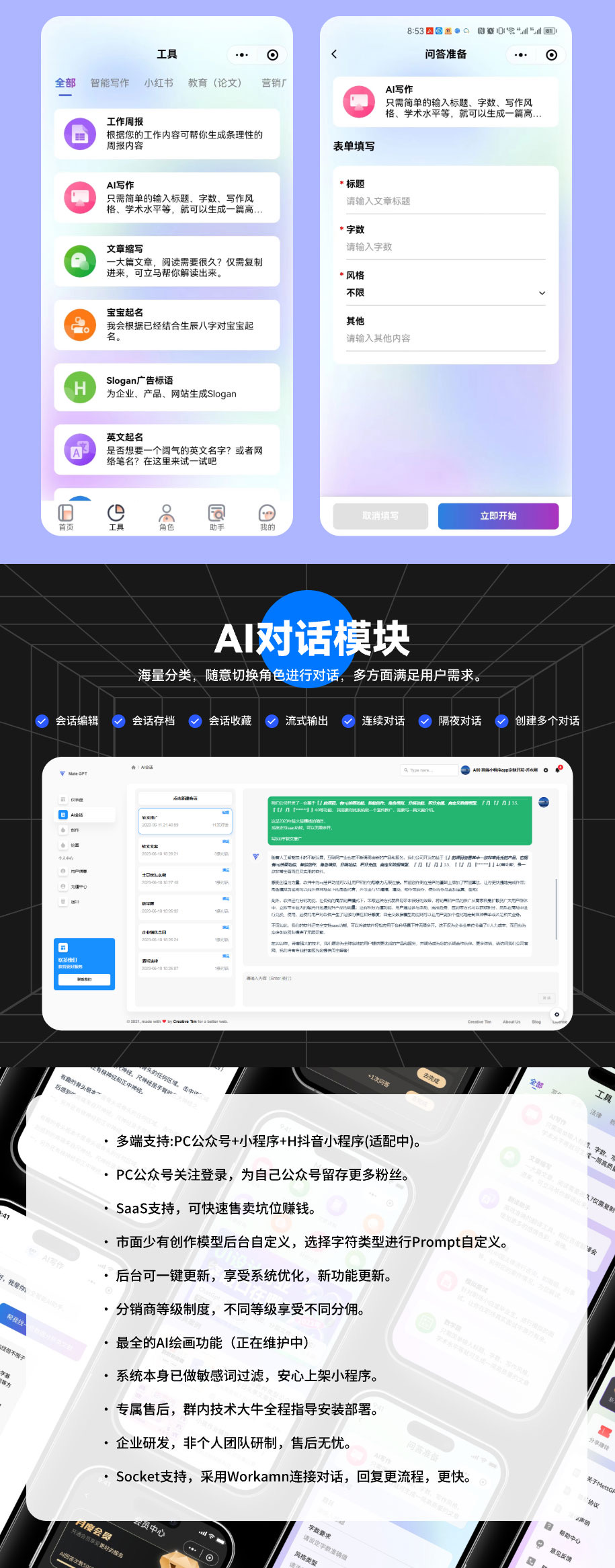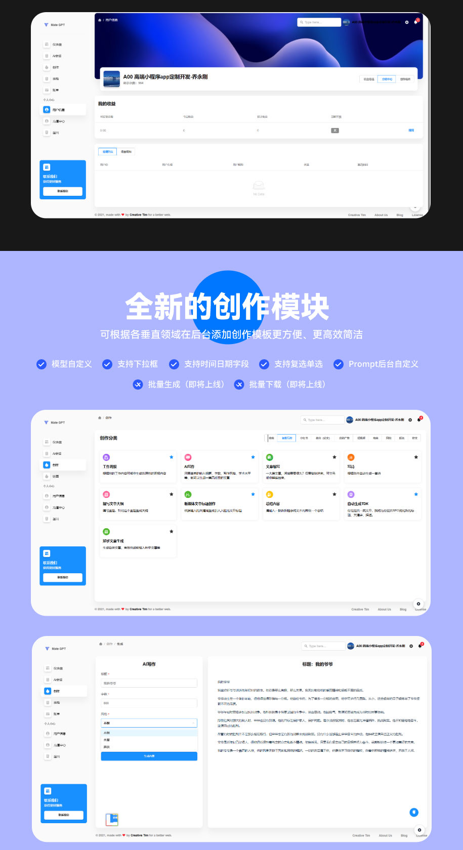 我们的系统提供了许多强大的功能,包括mj绘画、智能创作、角色模拟、分销功能、积分充值、自定义数据模型等等。此外,我们还支持 gpt4.0、手机端、小程序、PC端、saas功能、绘图支持以图生图、以文生图等。